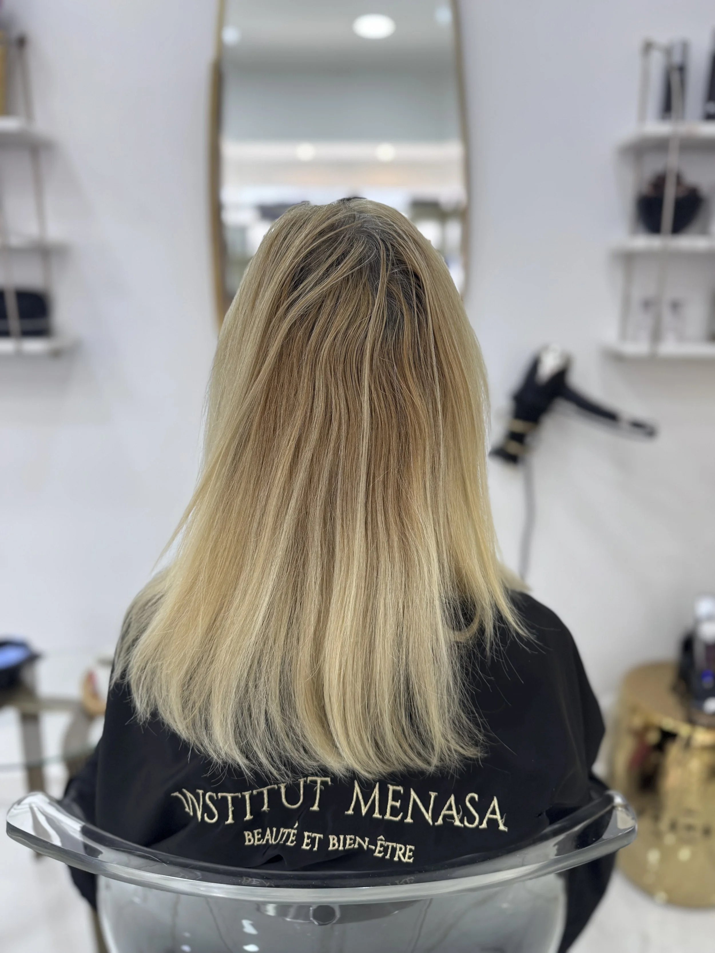 L’ombré hair consiste à conserver une couleur plus foncée aux racines, qui s’éclaircit progressivement vers les longueurs et les pointes. Cette technique crée un dégradé de couleur élégant, sans démarcation nette, et s’adapte aussi bien aux bases claires qu’aux cheveux foncés.L’Institut Menasa propose un ombré hair sur mesure, qui respecte la structure du cheveu tout en apportant éclat et profondeur à la couleur. C’est une solution idéale pour celles qui veulent un effet lumineux avec un minimum d’entretien.Les points forts de l’ombré hair :